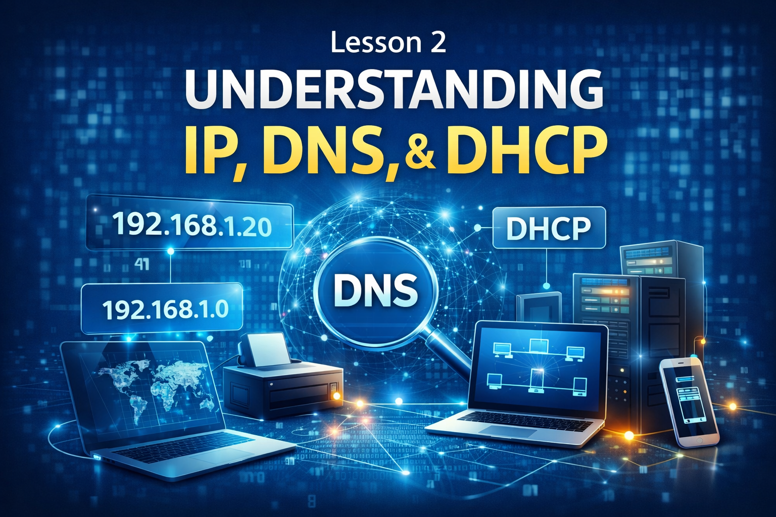 In this lesson, you will explore how devices identify and communicate with each other on a network. Key concepts such as IP addresses and subnets are explained in a simple, practical way. You will also learn how DNS translates domain names into IP addresses and how DHCP automatically assigns network settings, allowing devices to connect and “talk” without manual configuration.