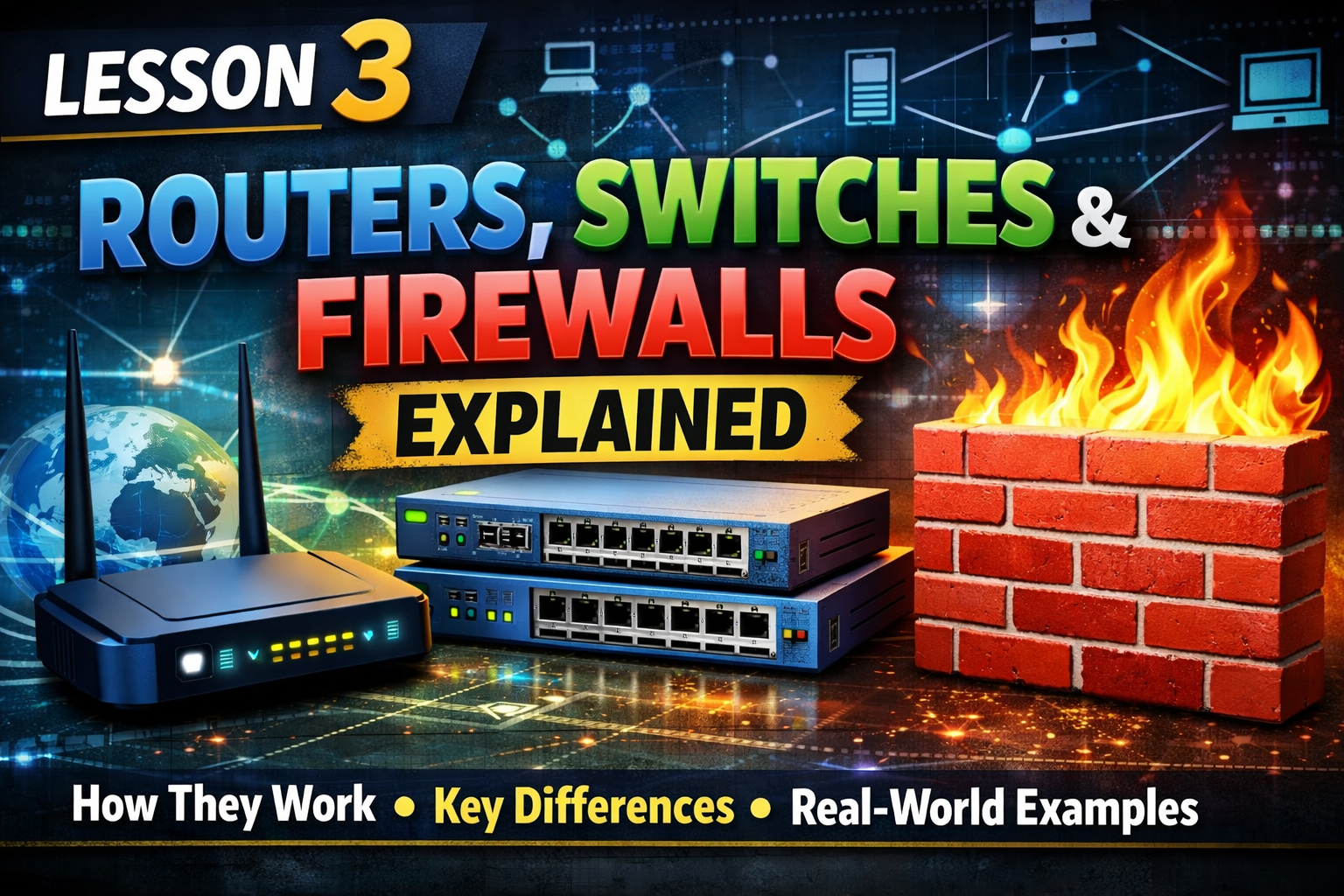 This lesson breaks down the roles of essential networking devices. You will understand what routers, switches, and firewalls do, how they work together, and the key differences between them. Real-world examples are used to make these concepts easy to grasp, giving you a solid understanding of the core components found in most networks.