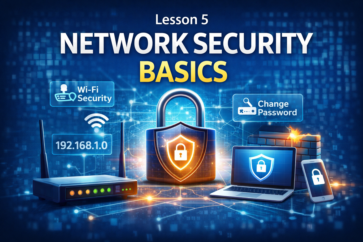 This lesson focuses on protecting your network from common threats. You will learn how to secure your Wi-Fi, change default credentials, and understand the importance of basic security practices. The lesson also introduces the use of built-in tools such as the Windows Firewall to help safeguard your devices and data.