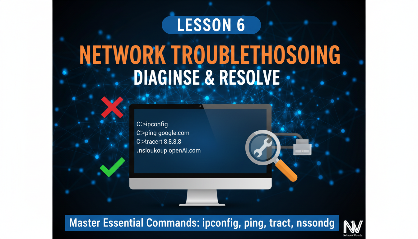 In the final lesson, you will learn how to diagnose and resolve common network issues using essential tools. Commands such as ipconfig, ping, tracert, and nslookup are explained with practical examples. By the end of this lesson, you will be able to identify connectivity problems and take the first steps toward resolving them effectively.
